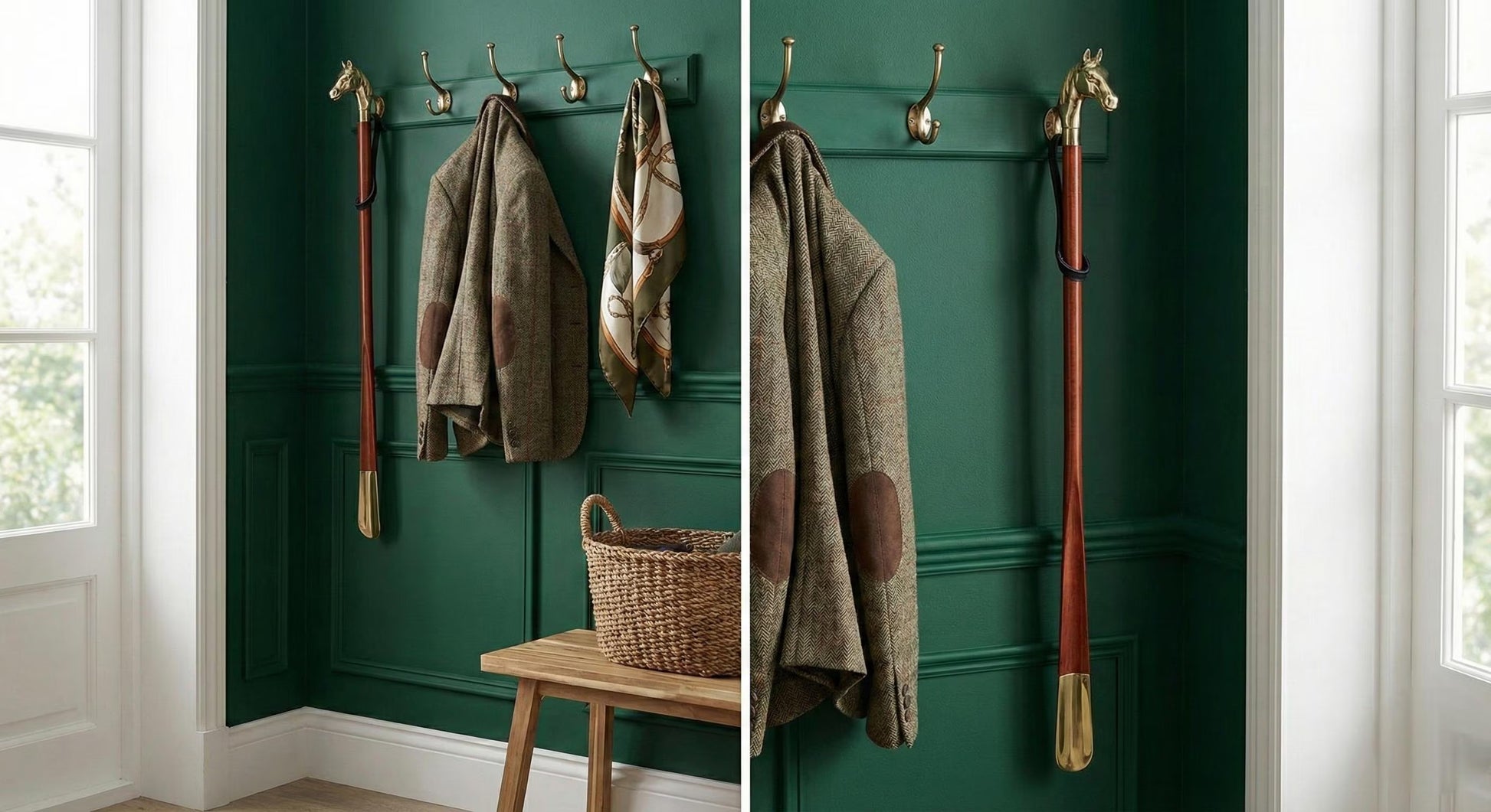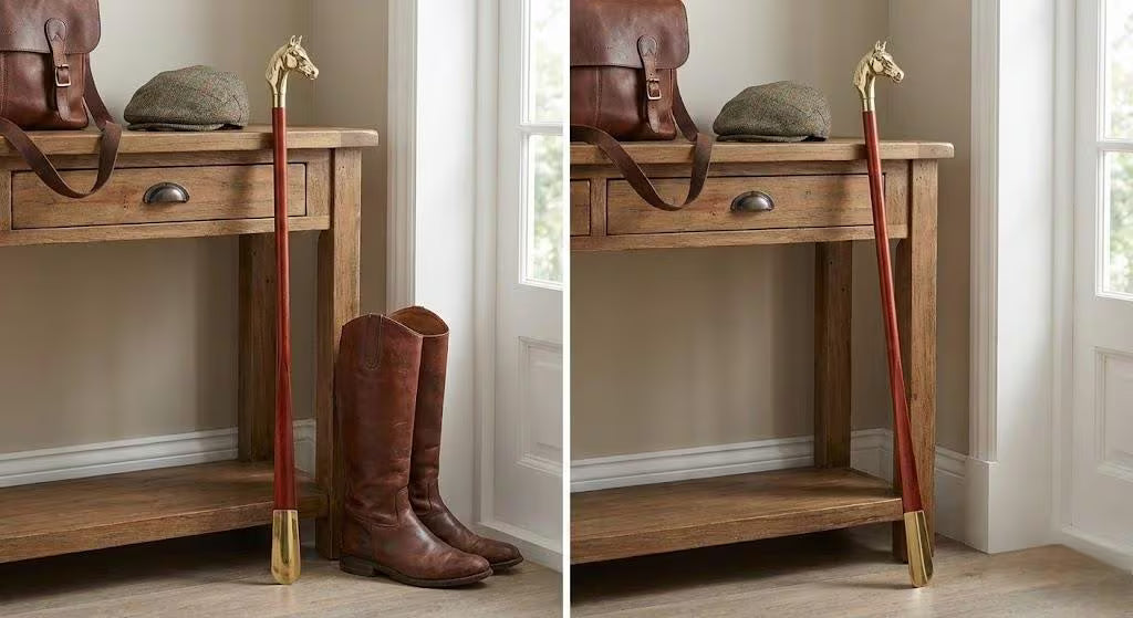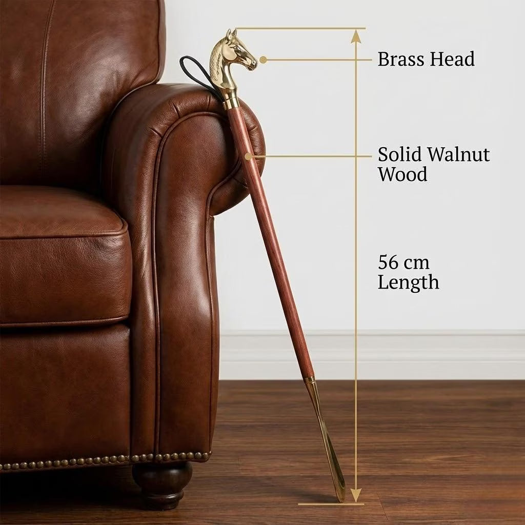 The handle features a sculpted horse head finished in a brilliant polished brass finish (Note: j'ai changé "gold tone" par "brass finish", ça fait plus authentique/luxe), offering a comfortable grip. The body is crafted from solid beech wood, stained in a deep walnut hue that brings warmth to any entryway or dressing room.